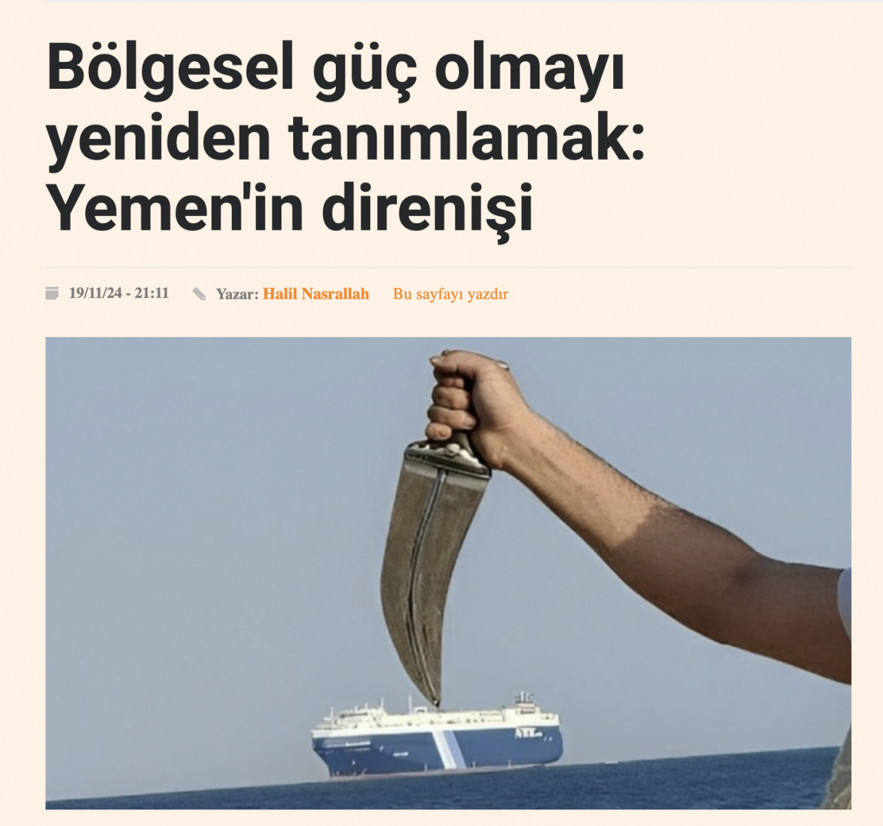 Makaleye göre, Yemen Silahlı Kuvvetleri, tarihte ilk kez deniz savaşlarına drone ve balistik füzeleri dahil ederek sürpriz unsurunu ustaca kullandı. Makalede, “Yemen’in yöntemleri ve taktikleri, Batılı hesaplamaları bozdu ve teknolojik üstünlüğe dayalı hızlı zafer beklentilerini alt üst etti” denildi.