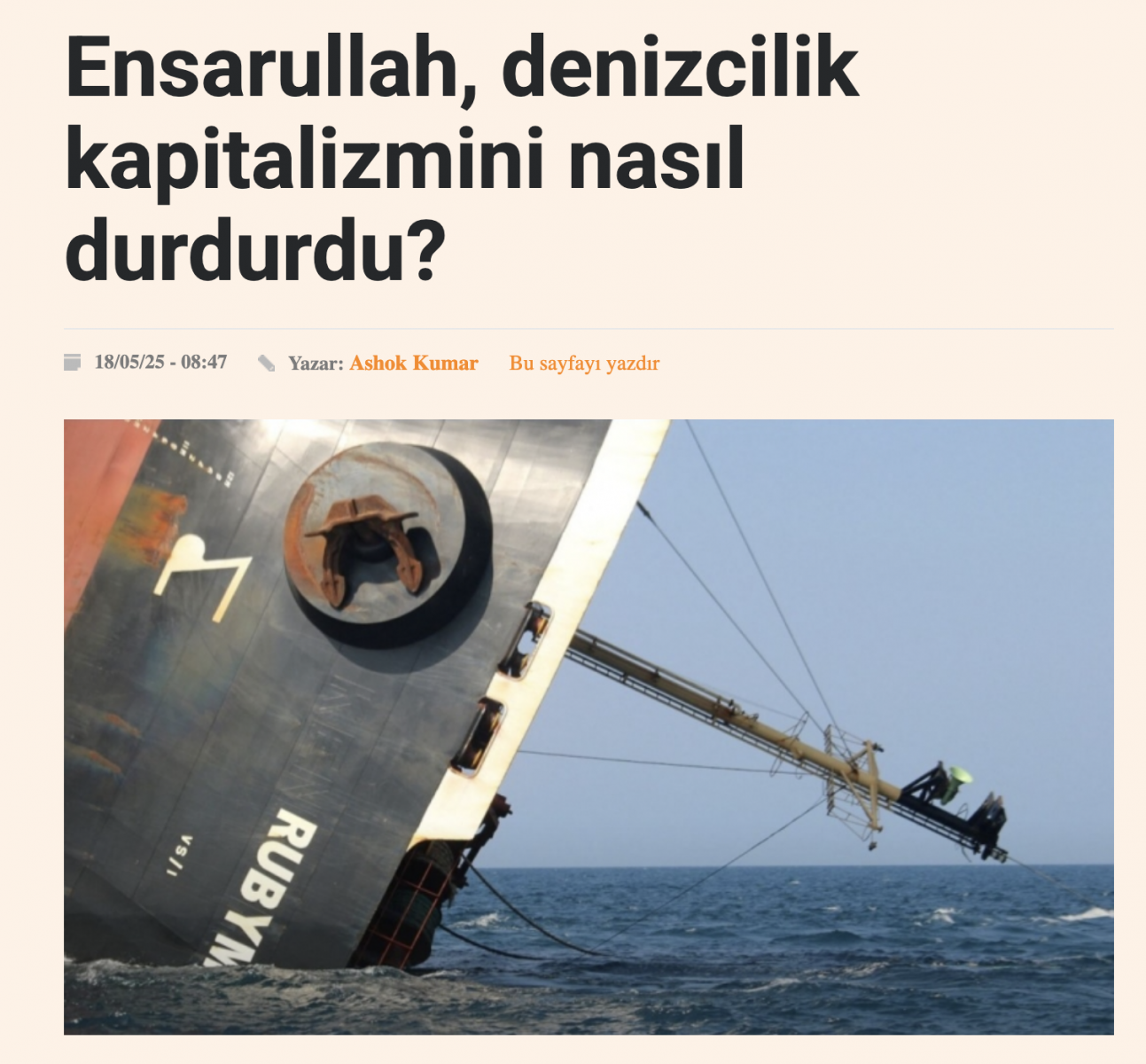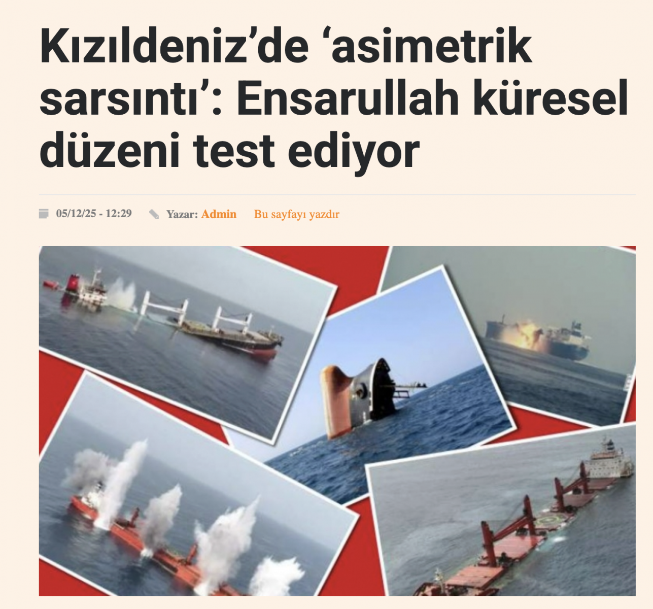 Makalede, Kızıl Deniz’deki çatışmaların artmasıyla birlikte beklenmedik saha denklemlerinin ortaya çıktığı ve bunun, geleneksel deniz gücünün sınırlamalarını ortaya koyarak deniz ortamlarında kontrol kavramını yeniden tanımladığı aktarıldı.