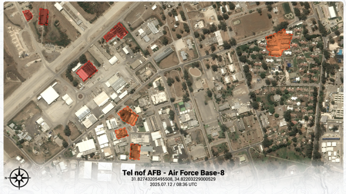 12 Temmuz 2025’te elde edilen uydu görüntüleri, İran’ın 12 günlük savaşta gerçekleştirdiği füze saldırıları sırasında, üssün merkezi bölümündeki en az dört yapının zarar gördüğünü veya yıkıldığını ortaya koyuyor.