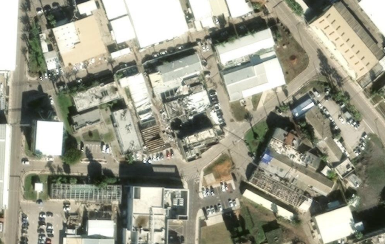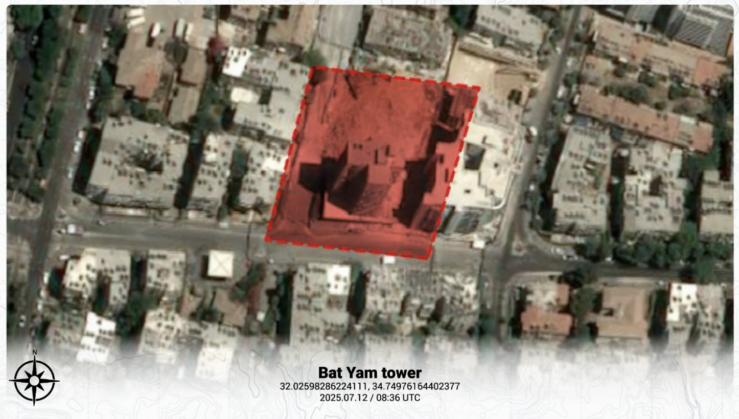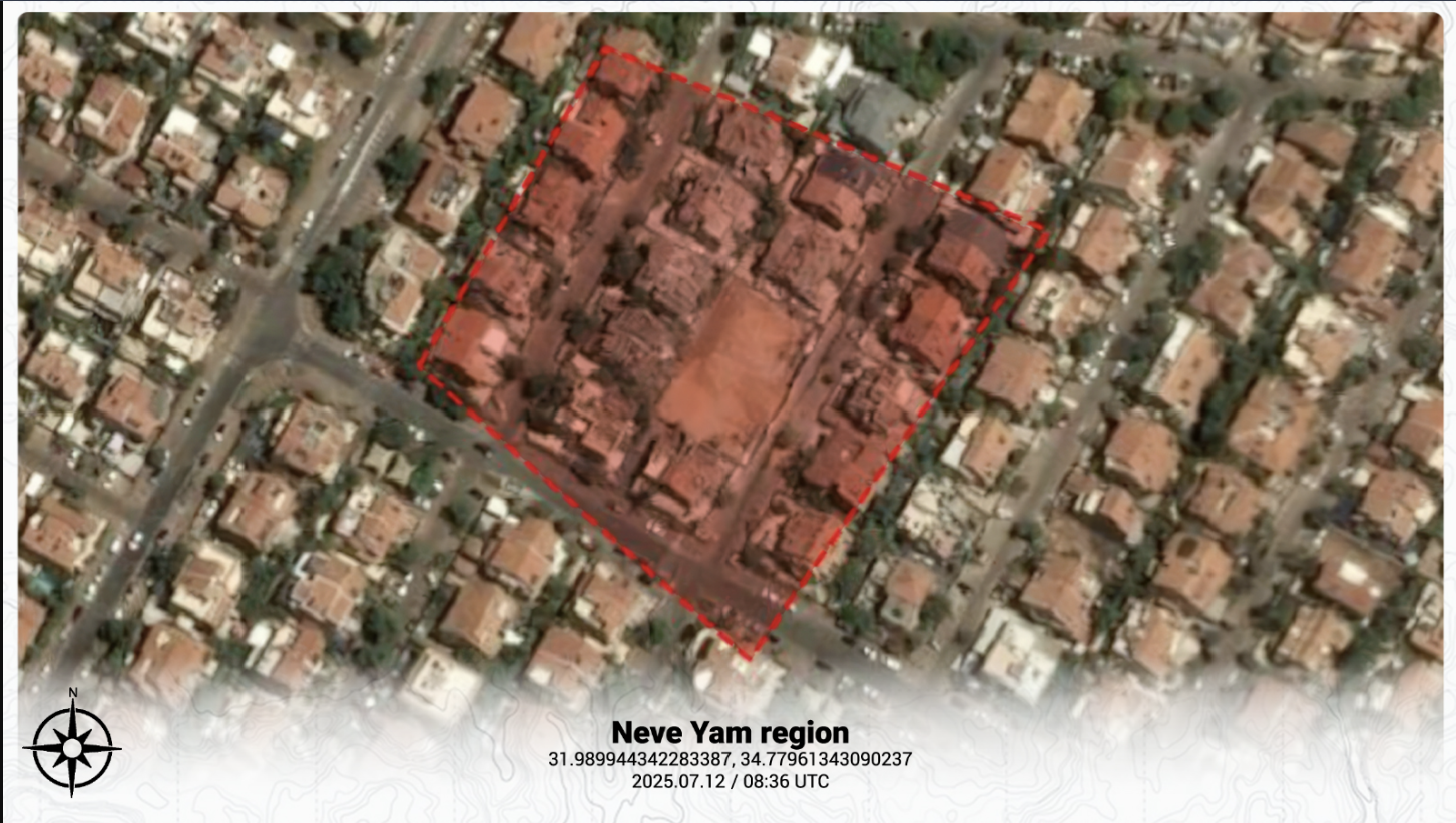 Saldırıya ait görüntüler ve 12 Temmuz tarihli uydu geçişleri, Nev Yam’da iki binanın doğrudan isabet alarak tamamen yıkıldığını ortaya koyuyor; enkazlar daha sonra temizlendi.