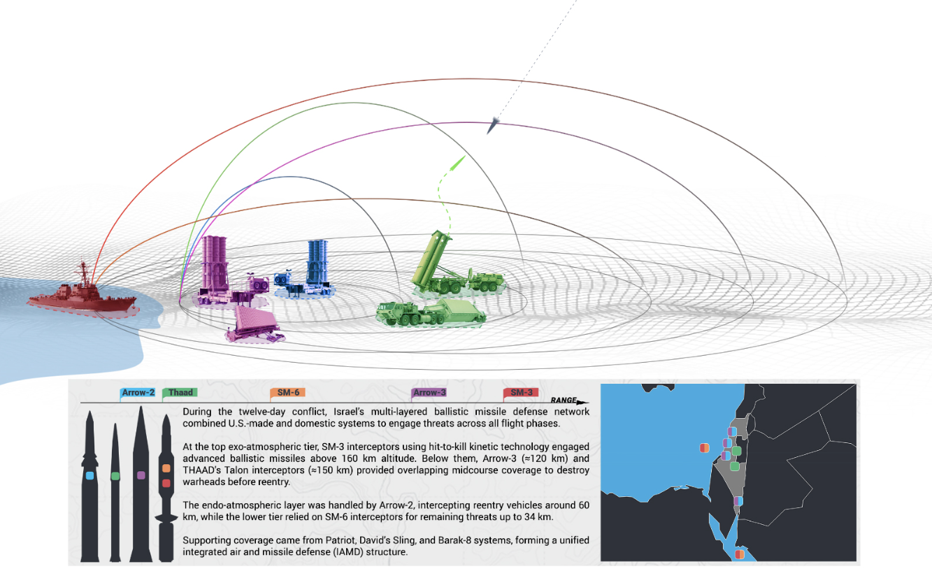 İsrail’in bu dönemdeki çok katmanlı savunma kalkanı, atmosfer dışı önleyiciler olan SM-3, Arrow 3 ve THAAD ile atmosfer içi önleyiciler Arrow 2 ve SM-6’yı içeriyordu.