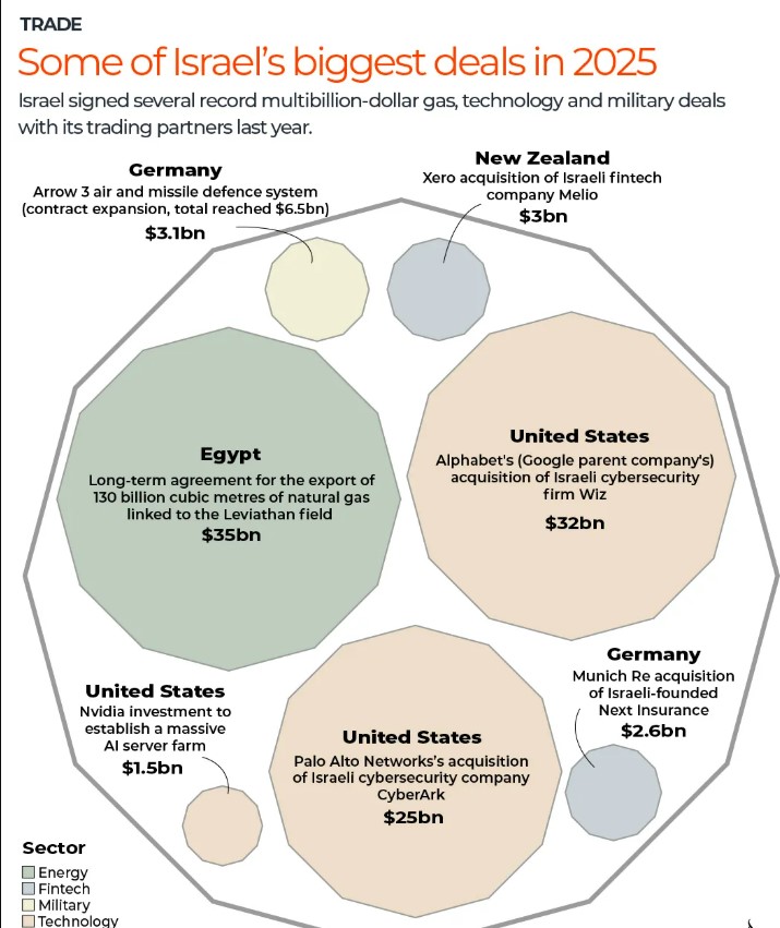 İsrail’in 2025’te enerji, teknoloji ve askeri alanlarda milyarlarca dolarlık anlaşmalara imza attığı aktarıldı.