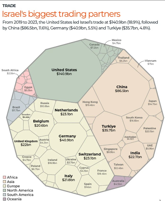 El-Cezire, İsrail’in ticaret ilişkilerinin uzun vadeli verilerle incelendiğinde, büyük anlaşmalarda aynı ülkelerin tekrar tekrar öne çıktığını belirtti.