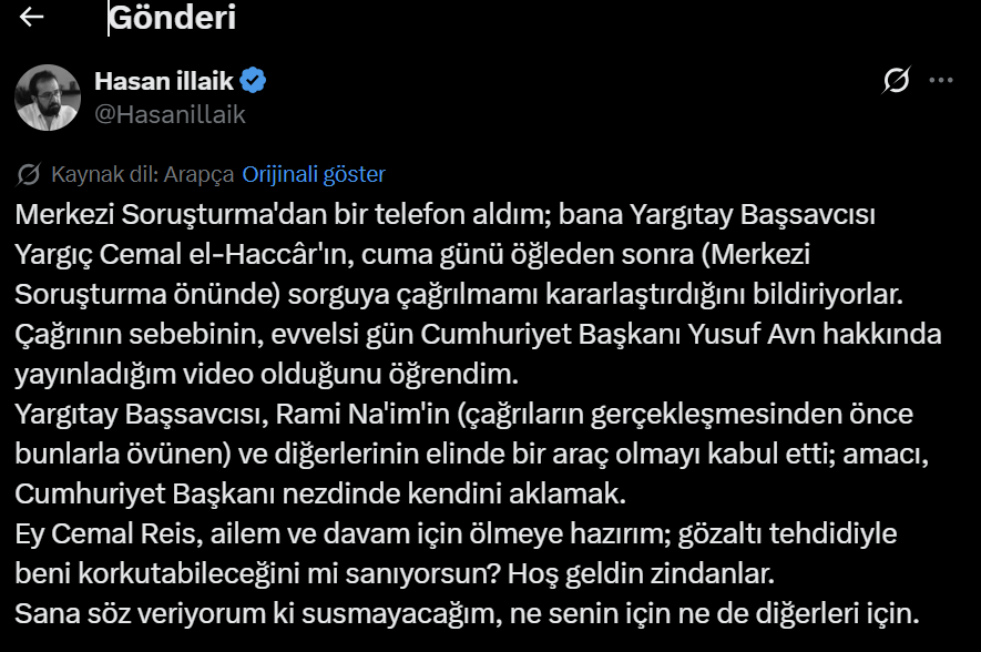 Platformun açıklamasında, Hassan İllaik'in, el-Mahatta’da yayımlanan ve Lübnan Cumhurbaşkanı Jozef Aun’un bir konuşmasını eleştirdiği programla bağlantılı olarak, Yargıtay nezdindeki Cumhuriyet Başsavcısı Cemal el-Haccar’ın kararı doğrultusunda, yarın Cuma günü Merkezi Soruşturma Dairesi’nde ifade vermek üzere çağrıldığı belirtildi.