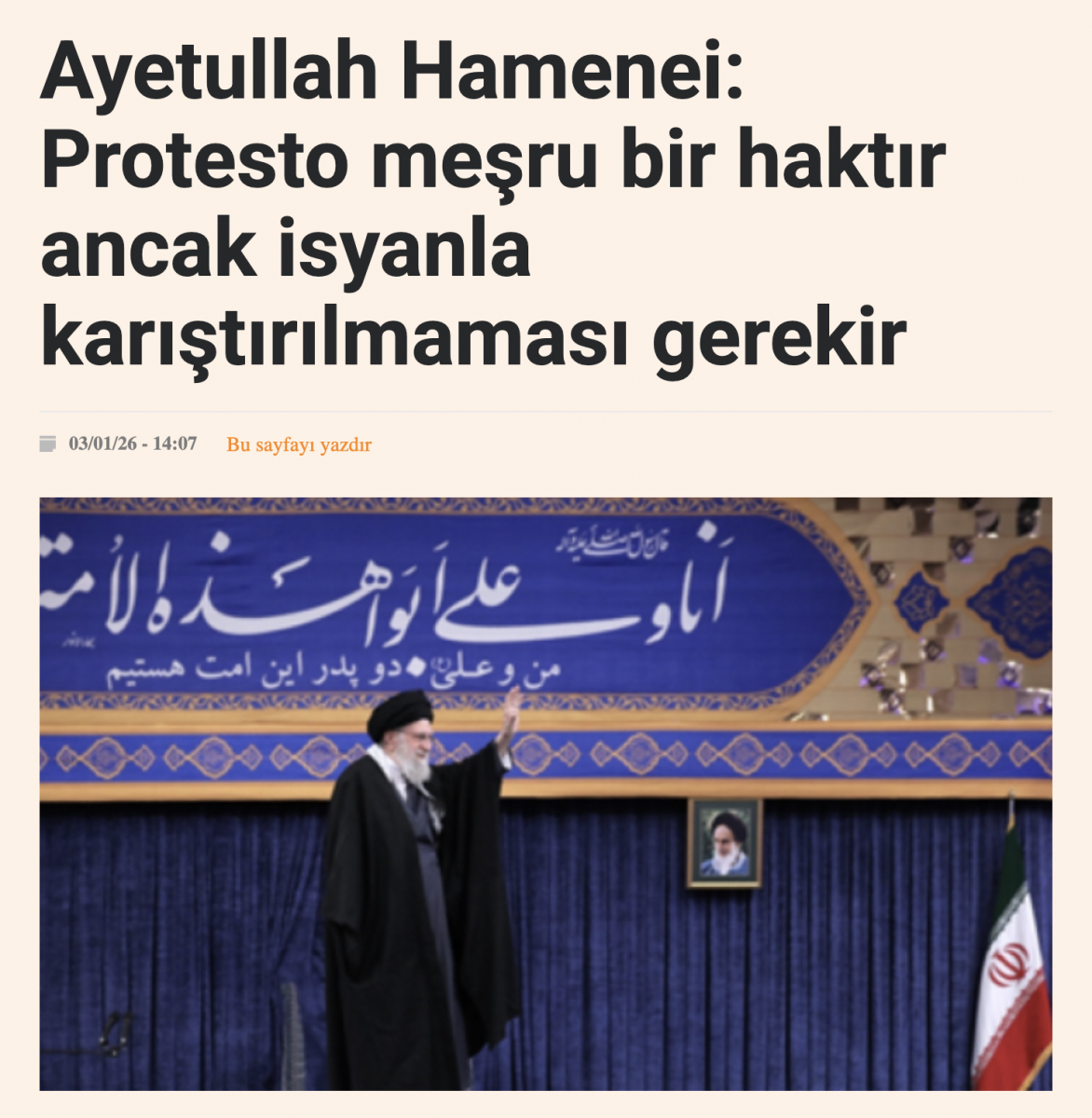Yabancıların "Size özgürlük ve refah getireceğiz" vaatlerine sakın kanmayın. Allah şahittir ki, onların İran’a, tarihimize ve İslam’a duydukları nefret o kadar büyüktür ki; eğer silahlı kuvvetlerimiz zayıf düşerse ülkemizi yerle bir ederler. Suriye’nin hali ortada. Düşmana bu fırsatı vermeyin.