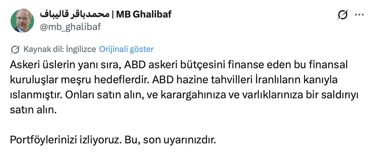 "Sadece askeri üsler değil, ABD'nin savaş makinesini fonlayan finans kuruluşları da artık meşru hedefimizdir. ABD hazine tahvillerine İran halkının kanı bulaşmıştır. Bu tahvilleri satın almak demek; doğrudan karargahlarınıza ve mal varlıklarınıza yapılacak bir saldırıya davetiye çıkarmak demektir. Yatırımlarınızı adım adım izliyoruz. Bu size son uyarımızdır."