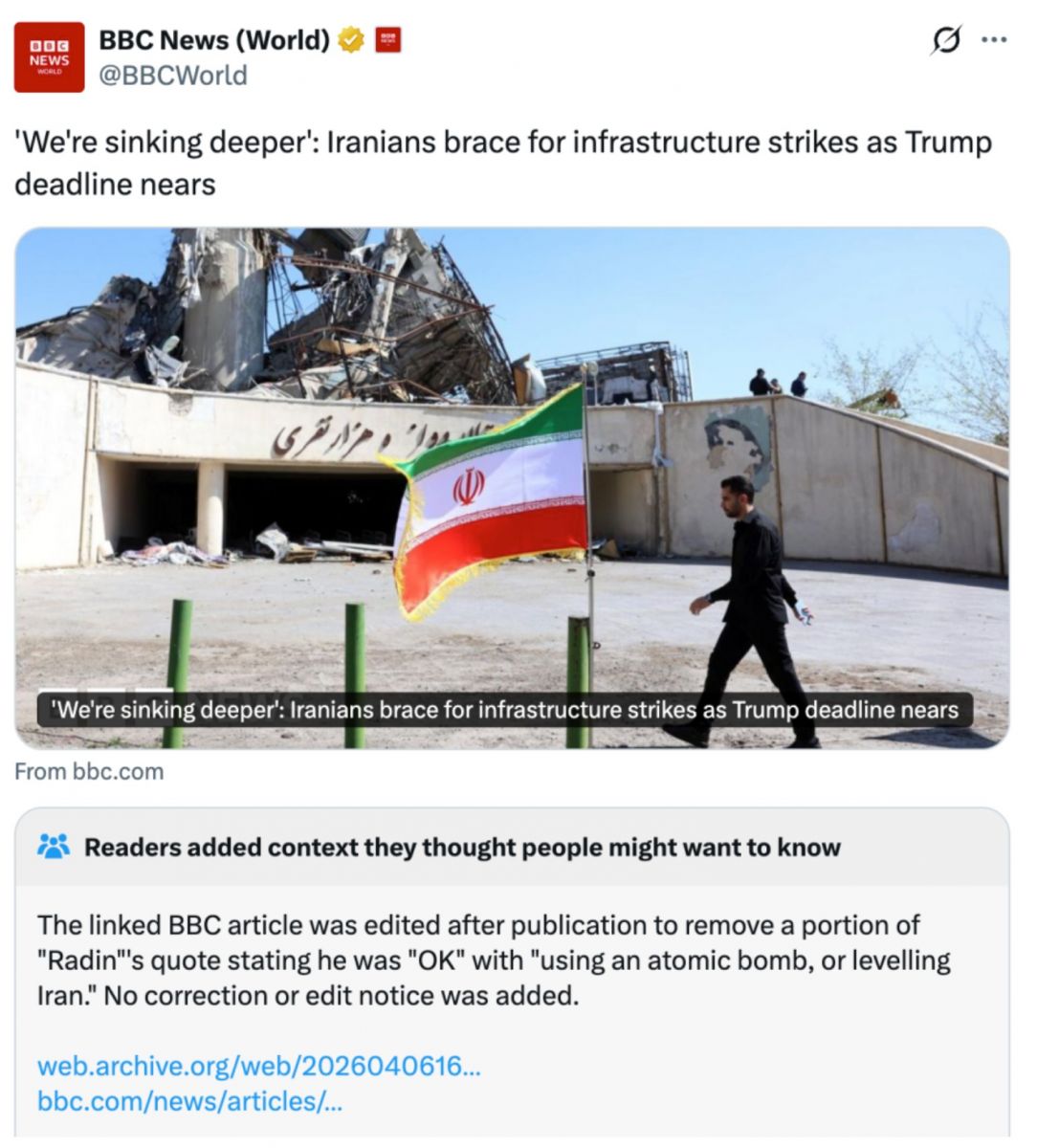 6 Nisan 2026 tarihinde sosyal medya kullanıcıları, BBC tarafından yayımlanan ve 20’li yaşlarındaki bir İranlıya ait olduğu belirtilen olağan dışı bir ifadeye dikkat çekti. Haberde yer alan ifadede şu sözler kaydedildi: