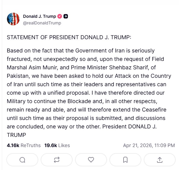 “İran hükümetinin ciddi şekilde parçalı bir yapıda olduğu gerçeğine dayanarak ve Pakistan’dan Mareşal Asım Münir ile Başbakan Şahbaz Şerif’in talebi üzerine, liderleri ve temsilcileri ortak bir öneri ortaya koyana kadar İran’a yönelik saldırımızı durdurmamız istendi. Bu nedenle ordumuza ablukayı sürdürme ve diğer tüm açılardan hazır ve muktedir olma talimatı verdim. Bu doğrultuda, teklif sunulana ve görüşmeler herhangi bir şekilde sonuçlanana kadar ateşkesi uzatacağız.”