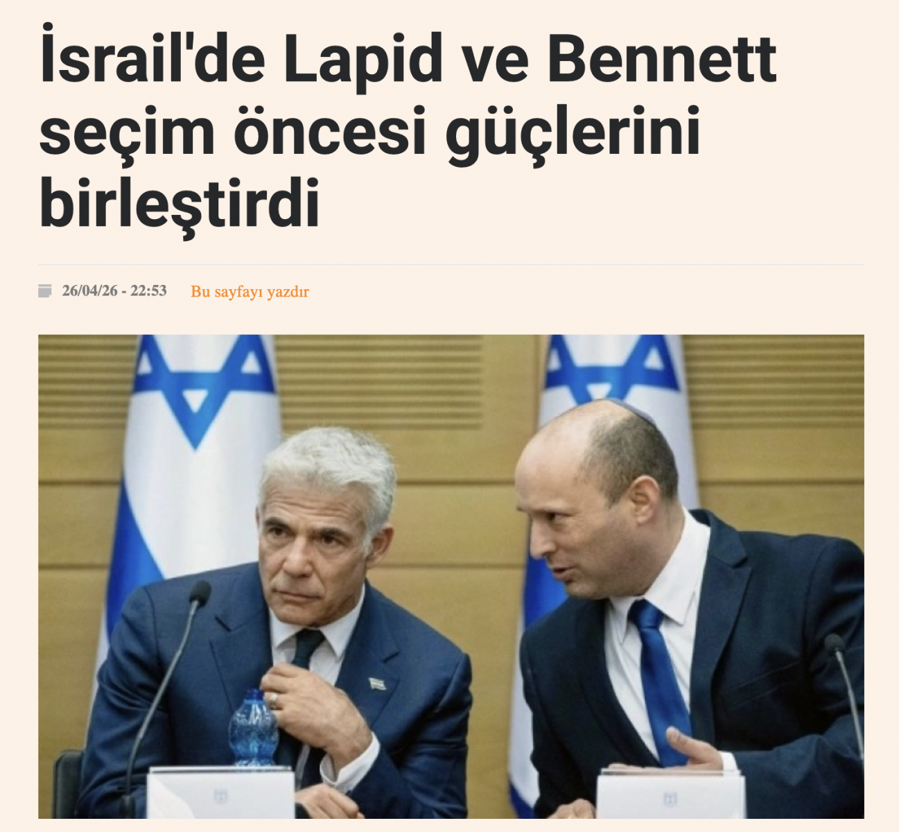 YDH- Eski İsrail Başbakanı Naftali Bennett ve Yesh Atid lideri Yair Lapid, seçimlere henüz altı ay varken siyaset sahnesini hareketlendiren sürpriz bir ittifak kararı aldı.