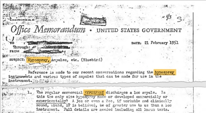 The Intercept’in haberine göre, 2 Şubat 1951 tarihli daha sonraki bir muhtırada, altı adet “hypospray” cihazı edinilmesine ilişkin inceleme yer alıyor.