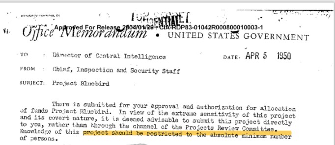 The Intercept’in belirttiği üzere, koleksiyonda “Project Bluebird”e ilk referans 5 Nisan 1950 tarihli bir ofis muhtırasında yer alıyor.