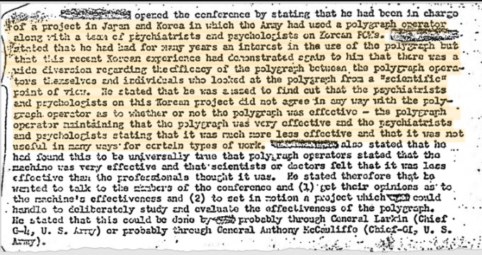 Belgede gerçek denizaşırı lokasyonlar gizlenmiş olsa da bir CIA toplantı notunda “Japonya ve Kore’de ordu tarafından Koreli savaş esirleri üzerinde yalan makinesi operatörü, psikiyatrist ve psikolog ekiplerinin kullanıldığı bir proje” yürütüldüğü ifade edildi.